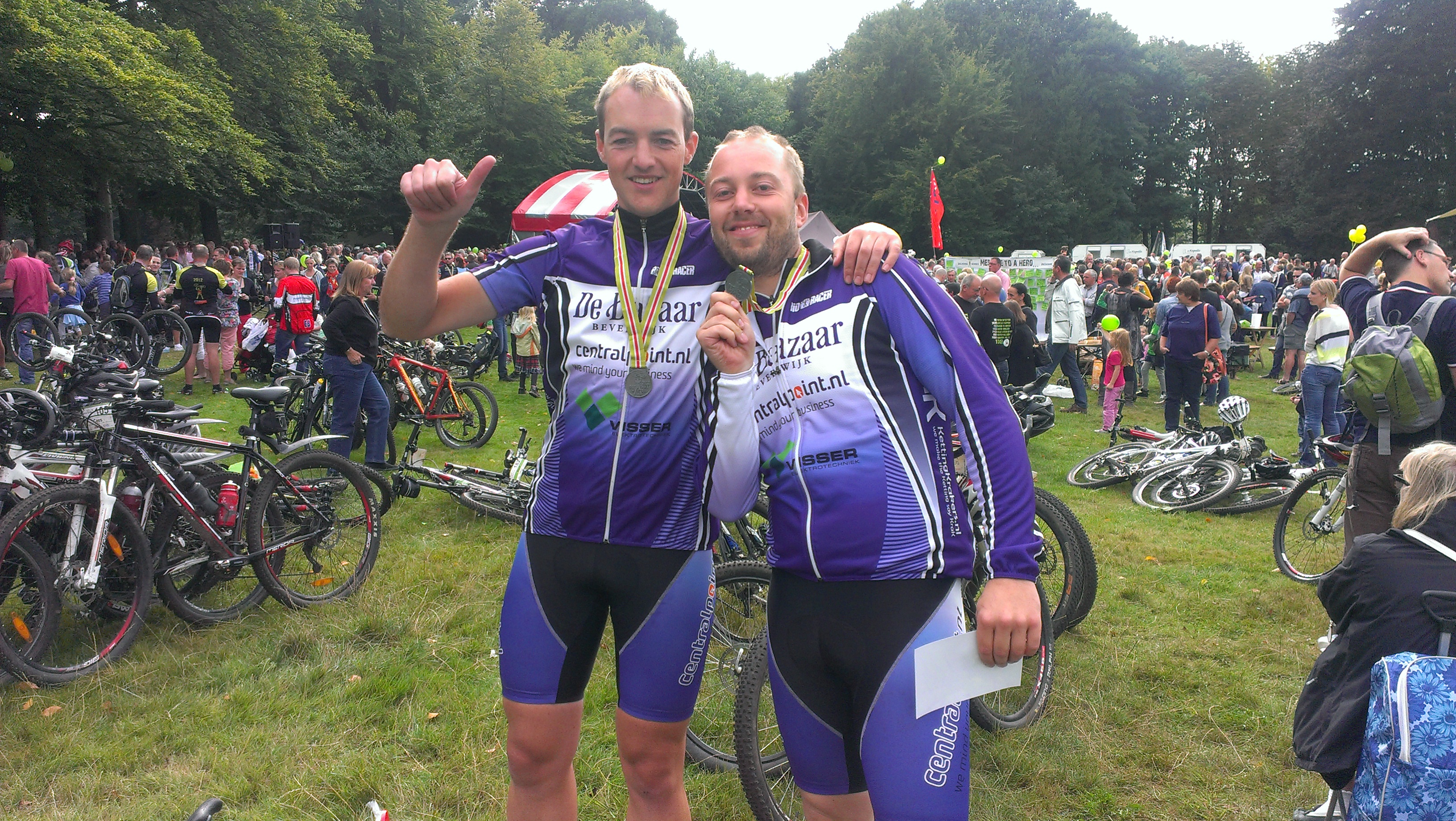 Een kilometer voor de finish wacht Richard op zijn maatjes. Die zijn verkeerd gereden, dus Richard staat 5 minuten te vernikkelen in de regen. Ineens ziet hij door de struiken iemand als een baksteen aan komen storten in een paarse outfit met een witte helm erbij… dat zou zo Alex kunnen zijn! Maar die kan hier toch nog nooit zijn?! Wel dus! Het mooiste moment van de dag. Gebroederlijk fietsen ze even later over de finish.